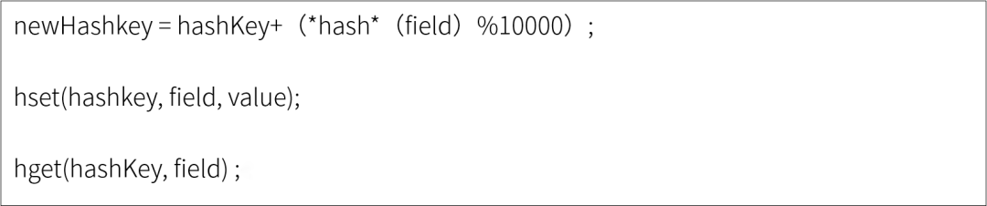 以hash为例,原先的正常存取流程是hget(hashKey,field) ;hset(hashkey,field,value)现在,我们可以分拆构建一个新的 newHashkey,具体做法:固定一个桶的数量,比如10000每次存取的时候,先在本地计算field的hash值,取模10000,确定了该field落在哪个newHashkey上。