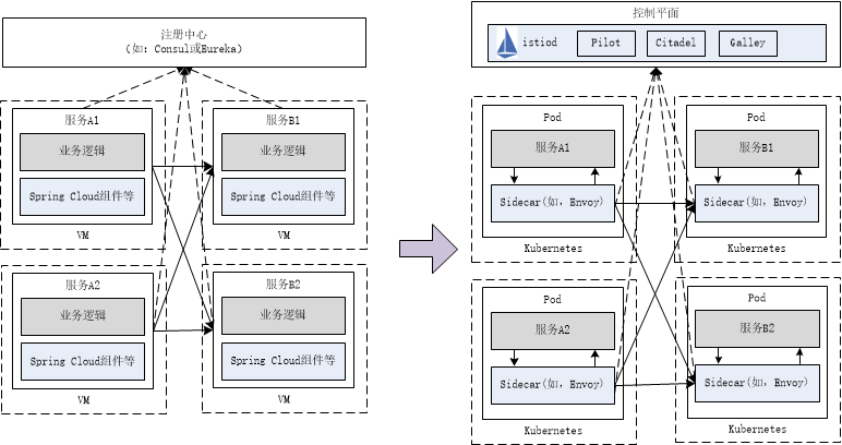 目前开源 Istio 已经成为 Service Mesh 事实上的标准,更是新一代微服务架构发展的趋势,因此公司希望尝试迁移到 Istio 框架,希望最终形成类似上图的右边部分。
