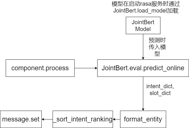 components的process函数 -> 文本和JointBert的模型传入 eval.preditce_online中进行预测,得到 intent_dict, slot_dict -> format_entity 格式化成rasa需要的entity格式-> _sort_intent_ranking 对intent进行排序 -> message.set 进行保存结果。