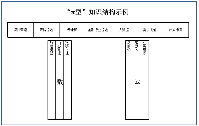 所谓“π型人才”, 上面的一横是指员工本身知识广博、经验丰富,“π”字下面那两竖指至少拥有两种或更多专业技能,并能将多门知识融会贯通的复合能力,它可能逐渐会成为21世纪架构人才的标准。“π型人才”对架构师知识的深度和广度都提出了很高要求,如下图所示意。