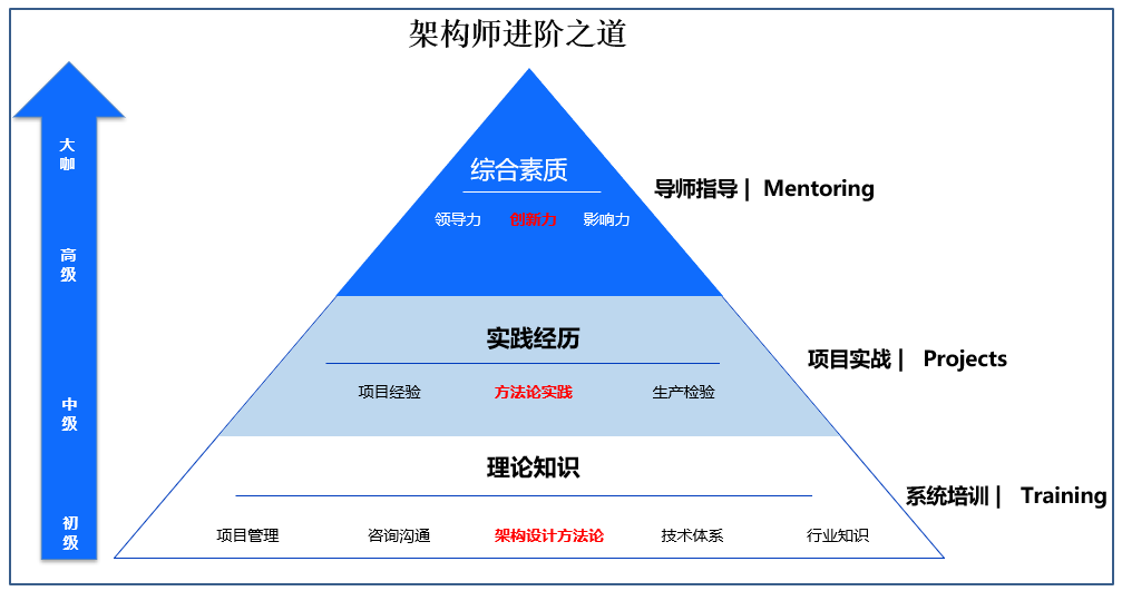架构师的成长同样是需要时间的打磨和实践的积累,有时也需要一些难得的机缘和修炼氛围,包括好的客户、好的项目、好的导师、好的团队等等。架构师的修炼是个漫长的过程,起步阶段,架构师需要有坚实的理论基础,包括架构设计方法论、项目管理、咨询表达、行业知识等,主要可以通过课程培训去学习;发展阶段,架构师需要方法论实践和架构设计的生产检验,主要可以通过项目实战(On Job Training)去提高;提升阶段,架构师需要呈现技术领导力、方案创新力和行业影响力,主要通过导师指导(Mentoring)去完成,架构师进阶途径如下图所示意: