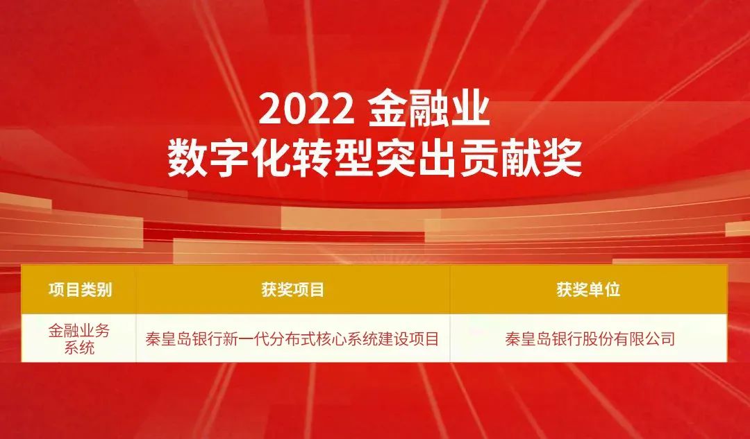 由BB贝博艾弗森官网参与建设的“秦皇岛银行新一代分布式核心系统建设项目”和“泉州银行新一代核心项目群”分别获评“2022金融业数字化转型突出贡献奖”和“2022金融业科技赋能业务创新突出贡献奖”。